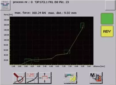 鉚接過程通常采用沖壓力—位置監(jiān)控系統(tǒng)進行鉚接最大沖壓力和底厚值監(jiān)控(見圖5)。根據(jù)鉚接實驗及試生產(chǎn)時的鉚接接頭數(shù)據(jù),設置鉚接峰值壓力的上下限,通過監(jiān)控凸模下行至止點位置的峰值壓力值是否在壓力上下限范圍內,監(jiān)控鉚點質量,同時可針對峰值壓力的超差報警,進行模具損壞或放錯零件等原因分析。因此,鉚接壓力上下限的設定十分重要,壓力上下限設置過寬,容易將不合格鉚點監(jiān)控為合格鉚點,造成零件質量問題漏判;而壓力上下限設置過窄,則會導致設備頻繁報警,影響正常生產(chǎn)。在實際生產(chǎn)過程中,需加強鉚點壓力數(shù)據(jù)積累,根據(jù)鉚點的底厚數(shù)據(jù)值進行壓力上下限優(yōu)化設定。
