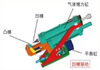 一般凸模驅動鉚接過程為凸模從上側厚板零件沖向下側薄板零件,而在零件制造過程中,厚板零件放置在下側時,需采用凹模驅動裝置,即氣液增力缸驅動上部薄板側凹模下行,保證凸凹模與板料貼合,而凸模沖壓下部厚板側板料進入凹模的動作需要采用平衡缸帶動整個槍體運動補償完成。平衡缸的設置也直接影響鉚點的底厚,平衡缸設置不合理容易產(chǎn)生鉚點底厚不達標,或鉚點周圍表面出現(xiàn)凹坑的現(xiàn)象,影響鉚接零件質量。凹模驅動設備如圖6所示。
