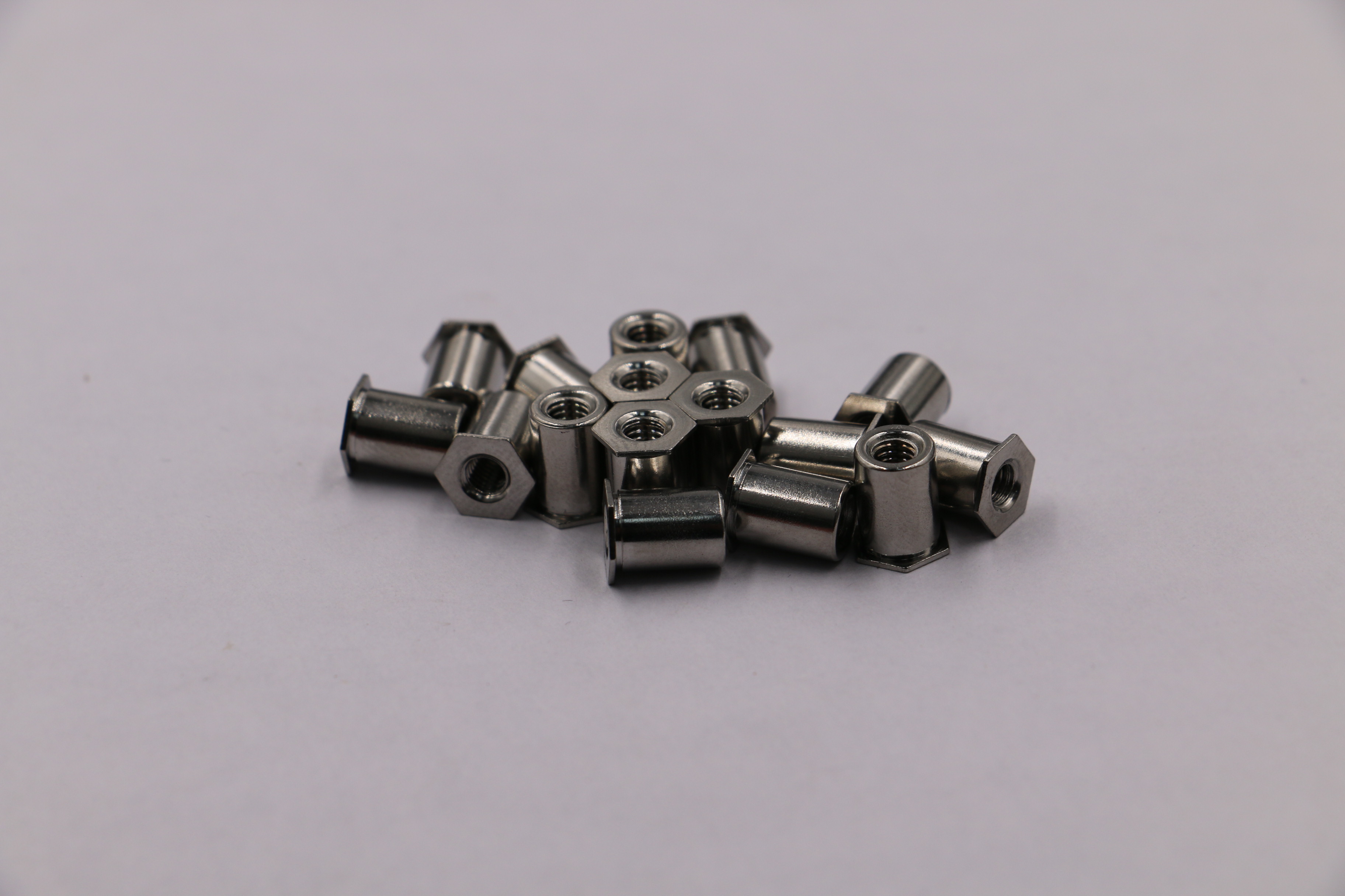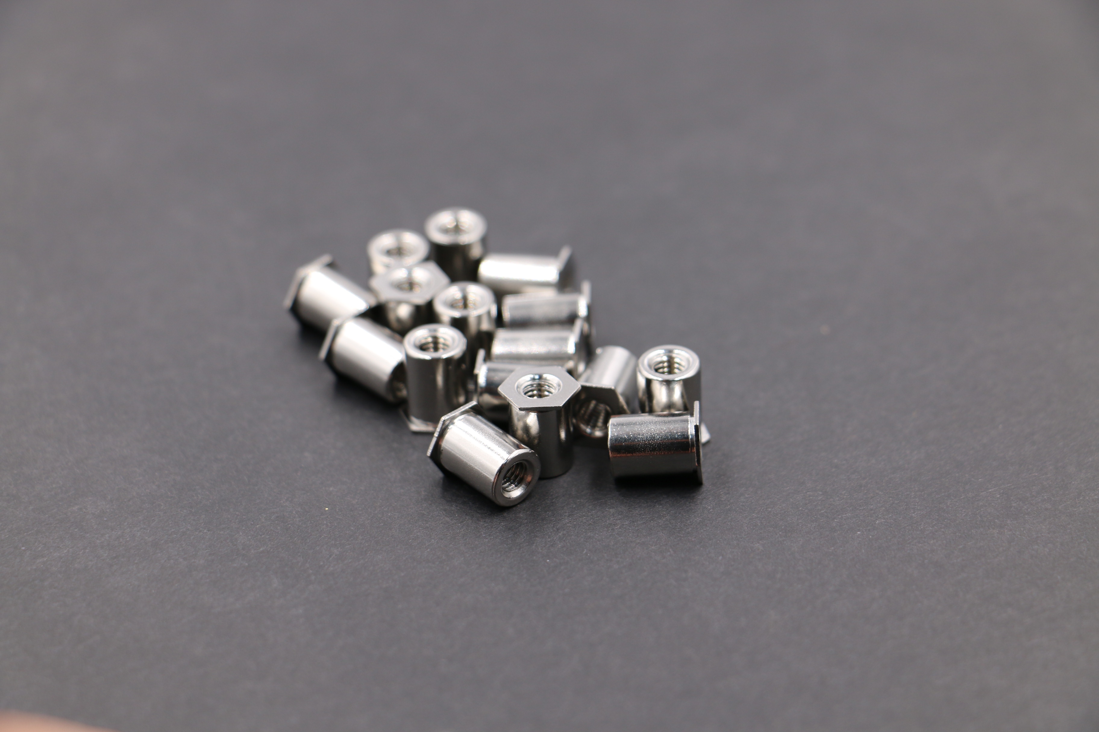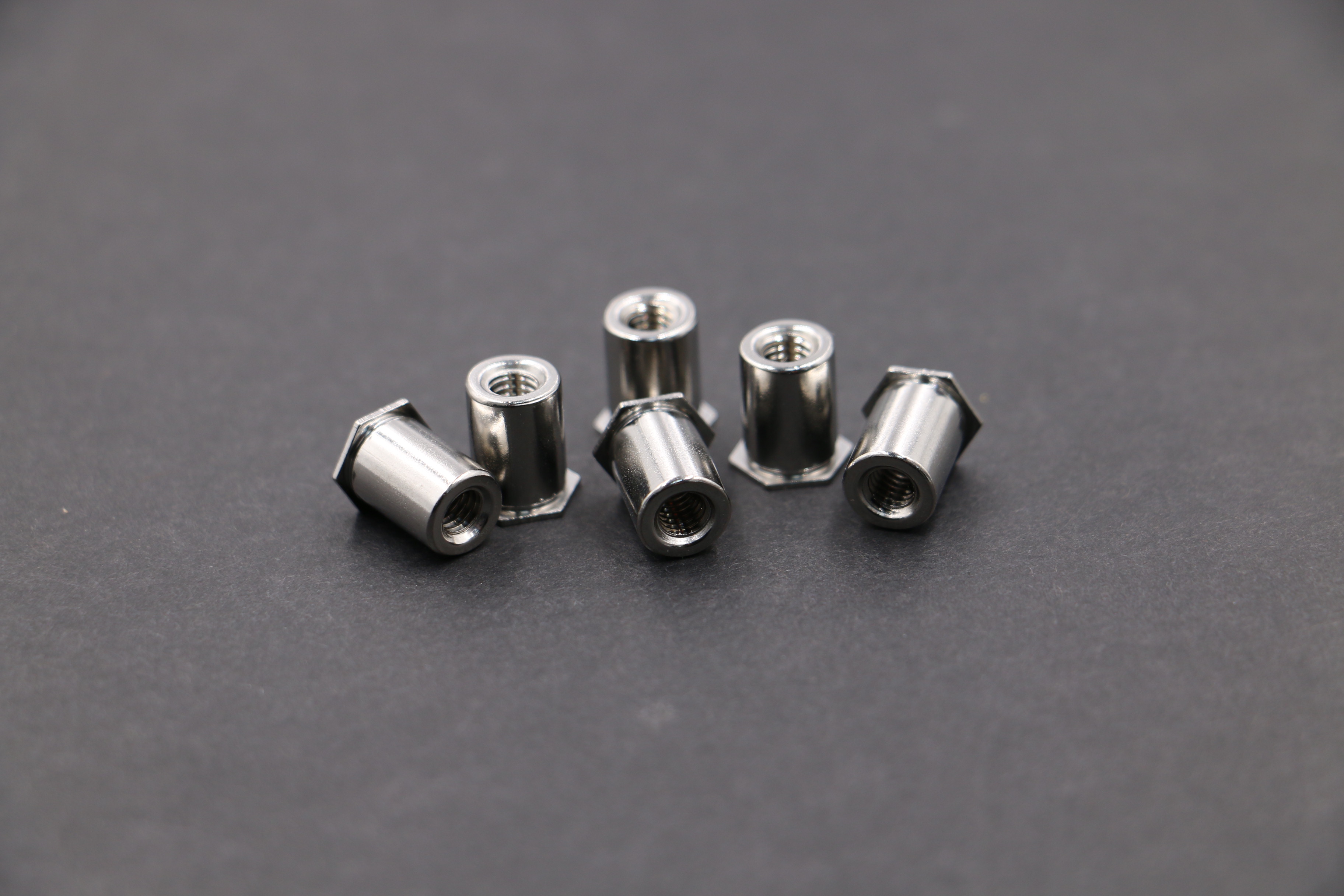 壓鉚螺母柱可在0.5mm厚的薄板上進(jìn)行鉚壓安裝,鉚壓后可在上面形成一個(gè)牢固的內(nèi)螺紋。采用鉚壓設(shè)備平行的在頭部向下壓入,利用壓鉚螺柱的六角邊和鈑金咬合,防止滑動(dòng)和脫落。壓鉚螺柱從外表形狀來(lái)看是帶內(nèi)螺紋的壓鉚標(biāo)準(zhǔn)件緊固件。