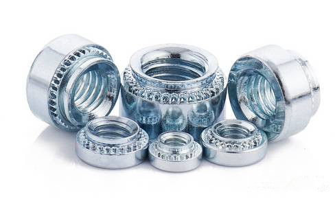 是應(yīng)用于薄板或鈑金上的一種螺母,外形呈圓形,一端帶有壓花齒及導(dǎo)向槽。其原理是通過壓花齒壓入鈑金的預(yù)置孔位,一般而言預(yù)置孔的孔徑略小于壓鉚螺母的壓花齒,通過壓力使壓鉚螺母的花齒擠入板內(nèi)使導(dǎo)致孔的的周邊產(chǎn)生塑性變形,變形物被擠入導(dǎo)向槽,從而產(chǎn)生鎖緊的效果。
