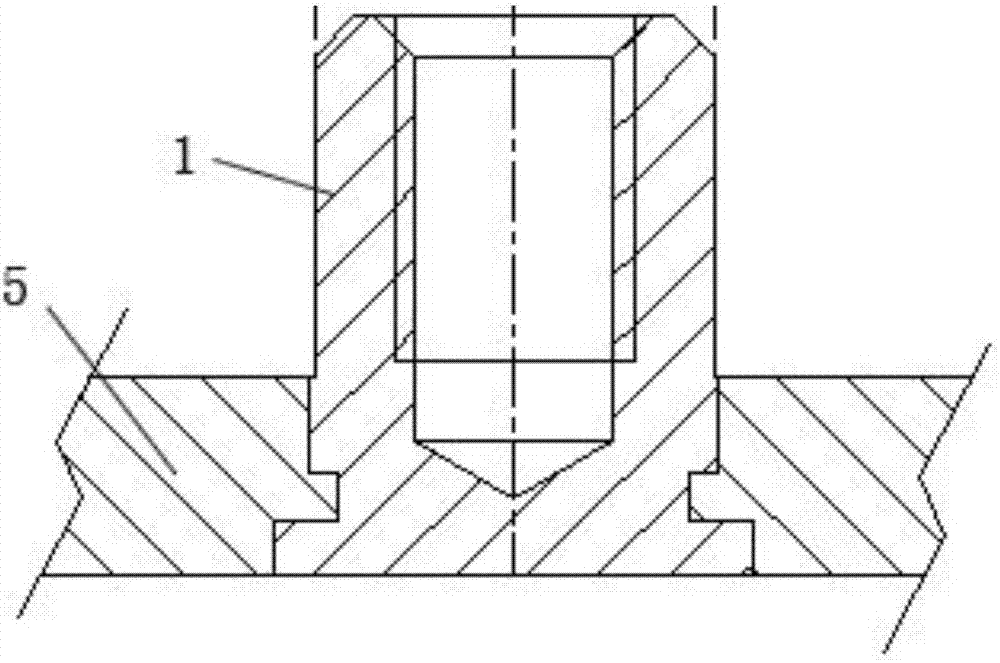 按上述方案,所述臺階部的高度小于或等于壓鉚件的厚度。壓鉚螺母柱,減少與鋁型材壓鉚底孔的配合間隙,由間隙配合變成過渡配合,增加壓鉚螺母柱的包緊力,使其在裝螺釘時能抵抗更大的裝配沖擊力和扭力,保證壓鉚螺母柱不松動,適用于表面質(zhì)量要求高的噴漆鋁型材面板領(lǐng)域。